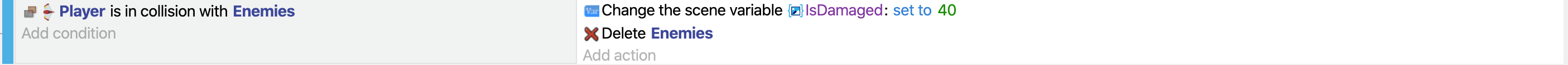 Then, add a new action to damage the player. We did the same above, but this time enter the value of "IsDamaged."